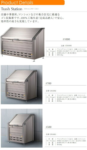 商 品 詳 細商品名Trash Station トラッシュステーション 【ゴミ収納庫#1000 W1800×H1130×D680 CRA003】サイズW1800×H1130(アジャスター含まず)×D680材質アルミ(アルマイト加工) 底面:ステンレス容量約960L(45Lゴミ袋 約21個分)重量約50kg備考大型商品につき、別途送料が発生する場合がございます。